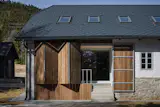 "The renovation approaches the building with respect toward all of its layers, both in terms of building matter and history. While the structure required cleansing from a number of interventions and modifications that had caused subsequent structural damage, we treated these flaws as an opportunity. The formerly damaged structure transforms into the beating heart of the house: the living area that opens into the garden and into the kitchen in the preserved part of the building. The barn, now vertically extended, can serve as a utilitarian space or a place for autumn gatherings, halfway between inside and outside. The new layout allows for multigenerational use, with both units and shared spaces connected via a central staircase. The silhouette of the house is unchanged. New large-format glazing opens the interior to daylight and the surrounding landscape, while large shutters protect it from harsh weather as well as the eyes of passers-by when needed. The shutter rails remain visible, as does the exposed concrete. Blending into the historical landscape does not mean hiding the new layer brought by the renovation.