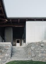 "On the outside, the volume is wrapped in a metal mesh and the walls are clad in exposed wood fiber and concrete insulating panels and galvanized metal sheets, creating a contrast between precise detailing and raw materiality. The new extension under the portico is a reflective box, also clad in galvanized sheet metal, which redefines the face of the building to express its new function.