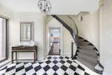 The home has been refreshed since the time Berlin lived in it, and the light-filled duplex now features classic architectural details, high ceilings, and a dramatic black-and-white entry. A circular staircase leads to a spacious living room with five picture windows that frame sweeping views of the surroundings. Other highlights include the formal dining room with an adjoining sunroom, which leads to a wraparound terrace and a sunny study/guest room with access to an upper terrace.