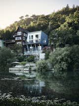 "The new building follows the steep site in section: only a single story with no openings is visible from the street. On the river side, generously glazed walls and terraced decks stair-step down the site to the water. Although the footprint is compact, the main living level revolves around a luminous double-height space with multiple vantage points to view the river, green hills, and sky.