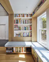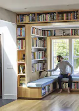 The owners now have a tranquil, highly organized library where they unwind. Its bottom shelves are deep enough for two rows of storage, and those just above the benches are covered for back support. The recessed LED lights provide a homey glow at night, and Poon snuck electrical plugs into toe kicks so the clients can work there or plug in a Christmas tree without disturbing their analog mise-en-scène. "I wanted the homeowners to feel like it's been there for them always, not like I forced an add-on or something artificial," says Poon. "The intention wasn’t to make it super-modern or super cool-looking or minimal-looking; it had to be warm and spacious at the same time, with a very personal connection."