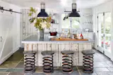 At the heart of the compound is the restored ranch cottage, approximately 1,250 square feet with two bedrooms and one and a half baths. Bluestone floors, board-and-batten walls, and open-rafter ceilings create a timeless ranch aesthetic, while reclaimed materials—including historic fence boards used for cabinetry, salvaged tractor springs converted to barstools, and 1920s Parisian lighting—connect the interiors to a deeply rooted history. A large screened porch overlooks the pool and surrounding landscape.