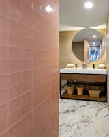 A lattice made of ropes surrounds the reception and being the lift the vertical axis connecting the different levels it was highlighted with wood-like ceramic combined with the façade´s blue glass achieving and overall impact.