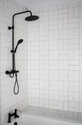 After: The new bathroom is straight out of Laura's Pinterest dreams, with stacked white ceramic tile (from Zia) and matte black fixtures (from AF Supply). She plans to add more plants to make the space even more serene.