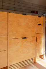 The apartment in the heart of São Paulo, Brazil, that FJ55 Arquitetos renovated for Carolina Quevedo and Marcus Watari was once a podcast studio. The space’s wide-open kitchen, dining, and living area is outfitted with tauari wood floors and features raw concrete ceilings, beams, and pillars.