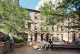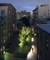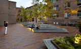The islands function as built in seating, flexible sub-spaces and protected soil volume for the distinct grove of a Honey Locusts which provides shade and comfort. The geometry and terracing of the courtyard creates a child friendly circuit for running, biking and play. Residents utilize the space daily to access their apartments, play with children, walk dogs, use the outdoor kitchen and host events ranging from building wide block parties to informal gatherings.