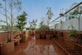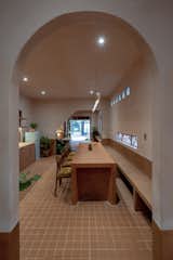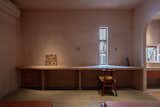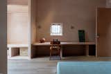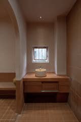 Pink porcelain tile with large chunks of recycled marble from Stonetile have a terrazzo effect in the powder bath. The Paro Vessel Sink from Mudd Concrete sits beneath a Rubinet faucet in unlacquered brass.