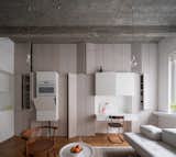 Situated underneath the wood ceiling, the upper-level apartment’s living room is elevated by a petite, functional kitchen.