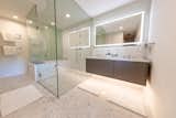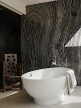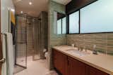 Cover Architecture and EEK Studio designed the custom vanity, which was fabricated by Hardwood Habitat. The wood door conceals the toilet room, while a pocket door separates the bathroom from the bedroom. The terrazzo floor tile is from Cle Tile.