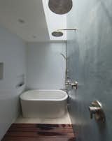 The focal point of the room is a glass fiber-reinforced concrete sink that weighs 460 pounds. The material is stronger then regular concrete, so the overall thickness of the sink is a mere two inches. By using GFRC, Archuleta was also able to create a more uniform surface with almost no pinholes—important both for maintaining the minimalistic appearance of the room and to avoid leaks in the areas that would be in direct contact with water. Concrete is also incorporated into the bathtub and shower bases.