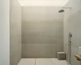 Tucked in a corner of the master bedroom, a curbless shower with Cea fixtures showcases a wall of patterned Italian tiles that coordinate with those used on the range hood in the kitchen.The designers sought to imbue the apartment’s minimalist framework with a handcrafted touch. “We wanted to add natural and warm elements to the palette,” Di Stefano says.
