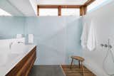 Another bathroom sports the Dwell Little Diamond tile in the Tropics Blue Crackle glaze from Heath Ceramics. The shower floor is also teak.