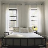 If letting your bed linens drape onto the floor or the platform bed frame just isn’t your style, keep your bedroom feeling sharp and tidy by tucking your sheets under the mattress and removing any extra blankets or fluffy comforters. A slim, white bed frame such as this one feels skeletal enough to still convey airiness.
