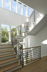 A chandelier by Lindsey Adelman hangs overhead. The floor-to-ceiling windows throughout are by Fleetwood Windows.