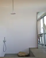 DeNiord designed a simple concrete bench with a honed top to run parallel to the randomly sized concrete pads that lead to the covered entry. He planted blueberry bushes behind the bench and a river birch tree behind the boulder. To conjure a wabi-sabi feel outdoors, diNiord poured concrete around a boulder. “It represents the interruption of perfect geometry,” he says.