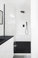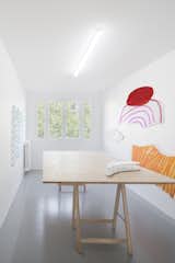 So the clicks of high heels wandering around the gallery space and the swooshes of slippers crawling towards the bathroom at night are perfectly satisfactory to the ears, the poured quartz-reinforced cement floor has a different number of resin paint coats in each room. This reflects in the barely noticeable difference between two shades of gray at each threshold.