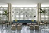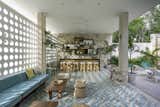 For the breezeway, Schwartz used concrete to achieve the feel of a hardscape courtyard. Uma basks beneath the egg-shaped opening.