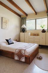 In the Dank Lounge, a film screen lowers in front of room-darkening curtains on movie nights. The deep sectional was built by Lizz and Isaac while the Blob coffee table is by Project Room, and the Scandinavian rya rug is vintage. The couple’s art collection includes works by many friends and local artists. A print by Alex Smith, along with drawings by Cammie Staros and Karl Haendel, hang in the lounge beside a painting by John Finneran and a photo by Lizz.