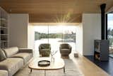 In the living room, the wood slats were fabricated on-site by the homeowner.
