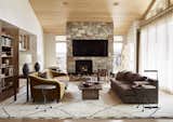 Large living spaces embody modern comfort. A stone clad wood-burning fireplace, lush furnishings in rich colors, soft textiles, and custom built-ins create a retreat worth staying in.