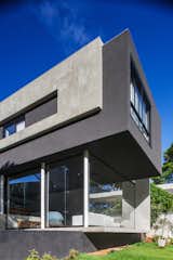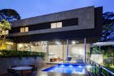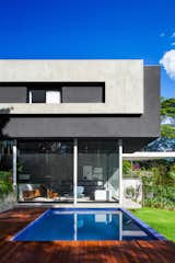 The larger volume of the addition, consisting of kitchen, living, and dining spaces, loops around to the smaller bedroom through a wooden passage. The same ipe, with differing finishes, is used for both the interior and exterior. Expansive sliding glass doors by Fleetwood dramatically open up the living space to the outdoors.