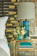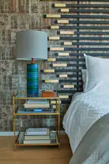 California mid-century modern lamps have their pattern echoed in the contemporary wallpaper by Inspirations. The wallpaper was chosen as a visual bridge to the High Line outside with its peeling birch bark trunks. The custom headboard in blackened wood with brass accents and turquoise bedframe are by Jarret Yoshida Inc. The box is vintage Japanese.
