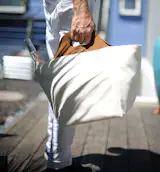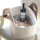 Materials: Double-layer of 18 oz canvas, third layer of a scorch-proof/wipeable lining, leather handle, removable easy-grip leather handle