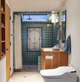 The custom natural oak vanity was fabricated by Greenpiece Furniture, with a quartz countertop in ‘Serena Gold’ by Vadara. The freestanding tub is by Kohler.