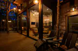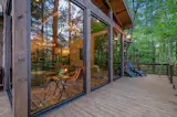 Exposed duct work allows for greater ceiling height to increase the expansiveness of the home and allowing more natural light into the combined living room and kitchen area. A live edge table and bench juxtaposes nicely with the sleak marbled counter tops. The clean wood walls also contrast nicely with the walnut finished tongue and groove ceiling.