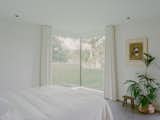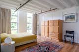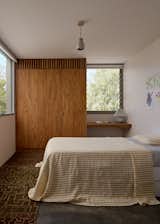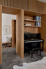 The contrasting style of the original home and the 70s-era addition come together in this space, now with white oak wall paneling and a twenty-foot-long, seven-foot-wide custom sofa designed by Office of Tangible Space. The painting is by Kathan Zerzan.