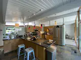 The penthouse loft, currently for sale, is perched in the building's south-facing corner and measures 1,818 square feet. Remodeled from floor-to-ceiling, the dwelling features a stark modern interior, complemented by original concrete and exposed structural elements.