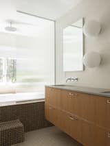 Repurposed Douglas fir (leftovers from concrete formwork from the house build) was used on the ceiling, with a Velux skylight. The custom Douglas Fir bookshelf was designed and fabricated by Kevin, with a desktop made from salvaged pine by Vintage Mill Werks and a Hay stool.