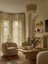 A collection of stone and ceramic objects rests on the living room’s Arhaus coffee table. They reflect the home’s focus on natural materials and a wabi-sabi aesthetic.