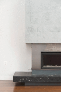 Raj and Watts extended the fireplace column to the ceiling to highlight the room’s expansive scale, and had it coated in concrete plaster. It was important to retain the wood-burning fireplace—a rarity in the city—but “we wanted to re-clad it in a material that also spoke to the industrial past of the building,” says Raj.