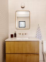 The existing Macael marble counters were polished to restore its original appearance. The cabinets were refinished, and additional tiles installed to accommodate a new opening for the fridge. The sink was relocated, and the space left by the old sink was replaced with a built-in wooden cutting board. The floors are terrazzo.