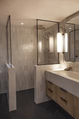 The team painted the exterior brick after patching it in places, like the section left by the removal of the door. “We could find the exact texture of brick, that classic Roman running bond, but we could not find it in the right color,” says architect Kailin Gregga. Painting the entire exterior unifies the façade. Rich Brilliant Willing “Hoist” sconces in Black was also added.