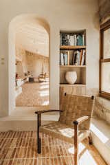 “I wanted you to come into a place that was inviting, but with a muted warmth,” says Kara of the decision to immerse the dining room in Farrow & Ball’s Green Smoke, including walls, ceiling, cabinetry, and fireplace, the latter with a relocated mantel. The table is a 17th C. Spanish Walnut Trestle Rectangular Dining Table via Restoration Hardware, surrounded by Ceremonie Green Mohair dining chairs by Athena Calderone, from Crate&Barrel. The Tambor Buffet, beneath windows that Seamus relocated from elsewhere in the house, is from Anthropologie.