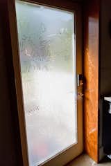 The backsplash design by local artist Carson Abbert, continues into the frosted pattern on the glass entrance door.