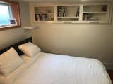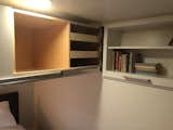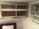 The kitchen is open to the living area with the bar between. There is space for shoes in the cabinet by the entry.