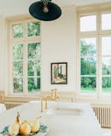 The sitting room connects with the kitchen and the breakfast nook beyond. Furnishings from Ariake, CH25, and Eberhart Bertha are complemented by a statement overhead light fixture by Moooi.
