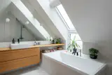 The cabin interior showcases a wood ceiling and walls and cork flooring.