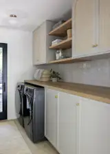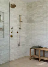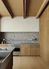The expanded kitchen has a large central island, with room for prep, seating, storage, and cooking. The cabinetry is a mix of wood, Shinnoki Milk Oak, and white fronts, Fenix NTM Bianco Kos. The terrazzo counters are by Concrete Collaborative. There are two types of tiles: the Mutina Rombini fluted tile on the island and Cepac Krave Sugar Tiles on the backsplash. “It looks very mid-century modern,” says Blaine of the backsplash tile. “But in this application, it also adds that little touch of depth that I think is really important to making the house feel interesting.” The counter stools are from Hay.