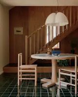 Secondhand furniture helped bring together the home on a tight budget. Jeff found a set of eight Danish teak dining chairs for around $400, and he refurbished them one by one. “They came with this beige fabric, but I know Kim would much prefer color so we bought a deep indigo fabric and I reupholstered them myself,” he says.