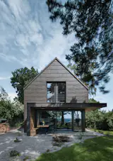 The exterior combines recycled brick, radial sawn timber, and galvanized roof sheeting. "Materials were selected to meet the clients’ brief that the house fit within the cognitive idea of an old shed," explain the architects.