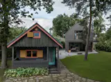 ADU seamlessly integrates with the 1915 single family home with an elegantly spacious wood-wrapped porch.