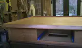 Bar & Back Bar; Cherry, Black Walnut, Hammered Copper Laminate, Suspended Glass Shelving, Downlighting, Refrigerator Opening, Lower Glass Storage with Lighting and Glass Shelves, Upper Backlit space for Holiday & Special Events Graphics or Text, Power and Cat 5 Connection.