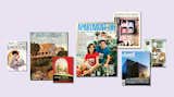 The home embraces indoor-outdoor living with a large sliding door that serves as its only window. A living room couch by Hubba Hubba (made of mattresses and upholstered fabric) wraps around a TOV Furniture coffee table, anchored by a custom Moroccan rug found on Etsy. The ashtray is by Fundamental Berlin and the mushroom lamp is by Rodolfo Bonetto for Iguzzini.
