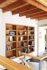 In the kitchen, both the timber frame and cabinetry are made of Douglas fir. “We wanted to keep the material palette limited,” says architect and homeowner Sherry Scott. A ladder leads to a loft that doubles as an office and extra sleeping space. The custom sectional in the living area is by Bimma Loft.