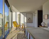A staircase winds up through the center of the house. Its structural spine is made of cross-laminated timber, while the screen that encloses it is made from slats of South African pine. “The timber screen separates the stair from the surrounding space but still allows glimpses through,” says Douglas. “It recalls Japanese screens, especially at night when it lights up like a lantern.”