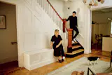 Inspired by a vintage Swedish design book, Ann gave the fireplace an asymmetrical shape and plaster finish, and the interior was rebuilt. The wood coffee table is by Muhly, and the metal one a vintage piece that Ann found later on, purchasing because she got a kick out of the similarities between them. "It made me laugh,